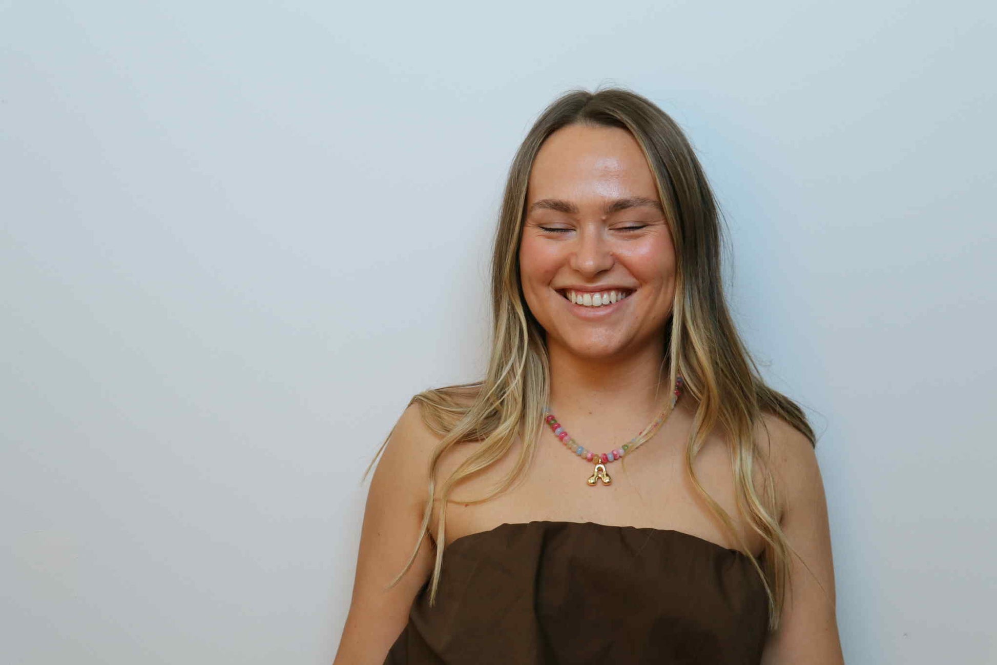 Our adult version of the Rory Necklace. Unique handcrafted necklace with a soft palette of pinks, reds, greens and blues with personalised initial hardware.